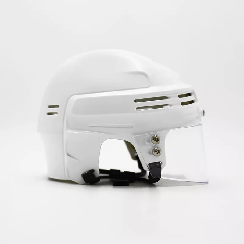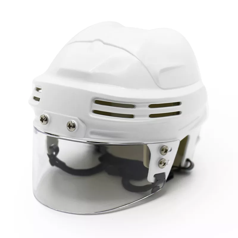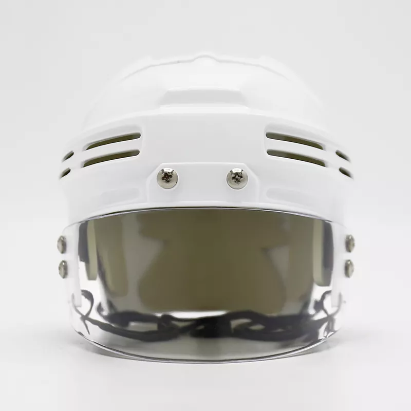 Der Mini-Eishockeyhelm ist eine verkleinerte Version eines Standard-Eishockeyhelms, der zur Präsentation oder als Neuheit gedacht ist. Typischerweise verfügt er über die gleichen Designelemente wie ein normalgroßer Helm, darunter eine harte Außenschale, eine Schutzpolsterung und einen Kinnriemen. Der Helm kann auch Teamlogos oder Farben enthalten, um eine bestimmte Hockeymannschaft darzustellen. Der Mini-Eishockeyhelm ist zwar nicht für den tatsächlichen Einsatz im Spiel gedacht, dient aber als Spaß- und Sammlerstück für Fans des Sports.